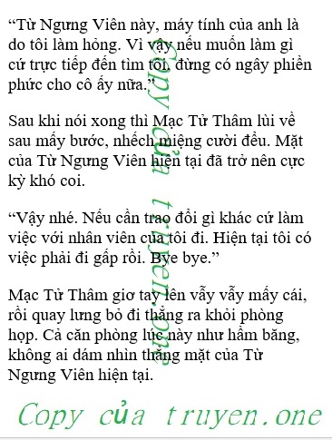 “Ở đây đã đến phiên anh nói rồi à?”, Mạc Tử Thâm gằn giọng. Người quản lý lập tức im bặt, không dám nói gì nữa mà chỉ ngồi xuống.
