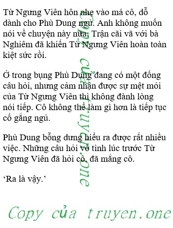 Phù Dung dùng ngón trỏ của mình, vẽ theo viền mặt của Từ Ngưng Viên, suy nghĩ bay đi xa. Bỗng dưng người đàn ông đang ngủ say mở mắt ra, Phù Dung giật mình rụt tay về nhưng không kịp. Từ Ngưng Viên bắt lấy bàn tay của Phù Dung, kéo cô xuống, ôm chặt cô vào lòng.