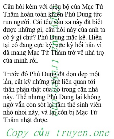 Phù Dung đặt bình nước xuống mặt bếp, quay lưng lại nhìn. Mạc Tử Thâm đang đứng cách cô khoảng năm bước chân, tựa vào thành cửa. Trong tay anh ta đang cầm một chiếc thẻ nho nhỏ màu trắng. Đây chẳng phải là thẻ sinh viên của cô sao?