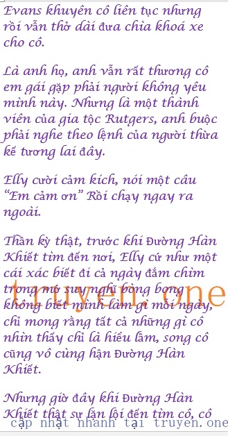 Evans giữ tay cô lại: “Elly à, em quan tâm đến sự sống chết của cái loại đàn ông vong ân phụ nghĩa như anh ta làm gì? Ngày đó anh ta và em gái anh ta tay không tấc sắt đến cầu xin Rutgers, chúng ta giúp anh em nhà họ hết mình, xem họ như bạn bè! Nhưng anh ta thì sao? Hiện giờ đã đứng vững ở Hà Nội rồi lại gây tai hoạ cho em! Em sắp kết hôn với cậu công tước đến nơi rồi mà anh ta gọi một cú điện thoại là em bỏ mặc tất cả liều chết quay về nhưng rồi? Anh ta chỉ đang trêu đùa em thôi! Elly à, anh ta không xứng đáng một chút nào. Nước chúng ta có rất nhiều đàn ông tốt hơn anh ta gấp trăm gấp nghìn lần, em đừng cố chấp vô ích nữa! Anh ta không yêu eml”