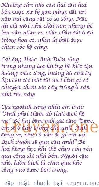 Trong sân không có ai nhưng bật đèn mấy phòng trên tầng hai. Bé lớn xoay người nhìn lên cửa sổ nhà mình ra ám hiệu với bé hai rồi nép vào tường đi vòng qua vườn hoa rộng hơn ở đăng sau nhà.
