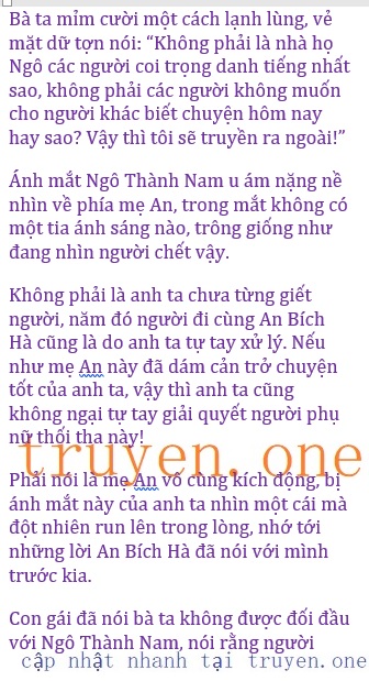 Ngô Thành Nam thở dài rồi lắc lắc đầu, nhìn về phía mẹ An, nói ra những lời lẽ vô cùng nghiêm túc: “Xét cho đến cùng thì An Bích Hà cũng tự làm tự chịu, chuyện cô ta phải vào tù không có bất cứ quan hệ gì với tôi hết, mà ngược lại là tôi vẫn luôn giúp đỡ cô ta. Với tư cách là mẹ của cô ta mà bà không những không biết ơn mà còn xông vào lễ cưới của tôi rồi còn xúc phạm danh tiếng của tôi, chính bà mới là người có tâm địa hiểm ác!”