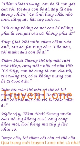 cô hai câu trả lời chắc chắn. Thứ nhất là cái ngày phán quyền nuôi dưỡng cho cô, cô có thể đưa con bé đi bất cứ lúc nào cũng được, tôi tuyệt đối sẽ không ngăn cản. Câu trả lời chắc chắn thứ hai, cô lên giường với tôi trong một tháng, đến lúc đó tôi sẽ suy nghĩ mà từ bỏ quyền nuôi dưỡng đứa nhỏ.”