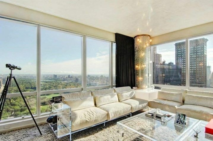 Khung cảnh bên trong cánh cửa thực sự rất đẹp, ghế sô pha màu gạo, thảm trải sàn màu xanh lục bảo, và bên ngoài cửa sổ thủy tinh dài từ trần đến sàn* là khung cảnh phồn hoa nhất trong thành phố.