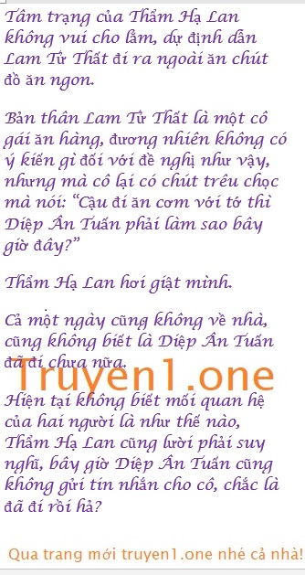 Lam Tử Thất thật sự hy vọng Thẩm Hạ Lan có thể sống tốt, nhưng mà bây giờ còn không biết là bầu không khí khó chịu giữa cô với Diệp Ân Tuấn phải kéo dài đến lúc nào, cô nhìn thấy mà lo lắng chết đi được.