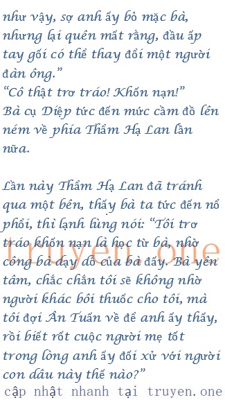 Câu nói của Thẩm Hạ Lan đã làm bà cụ Diệp sửng sốt, rồi nói: “Tôi làm sao biết được mình cần gì? Lát nữa tôi mới nghĩ ra được, cô làm con dâu nhà họ Diệp, nên tôi muốn gọi lúc nào chẳng được, dù gì cô cũng không đi làm, lại chẳng kiếm ra tiền, cô thật sự cho rằng mình là mợ cả, nên tới hưởng phúc à?”