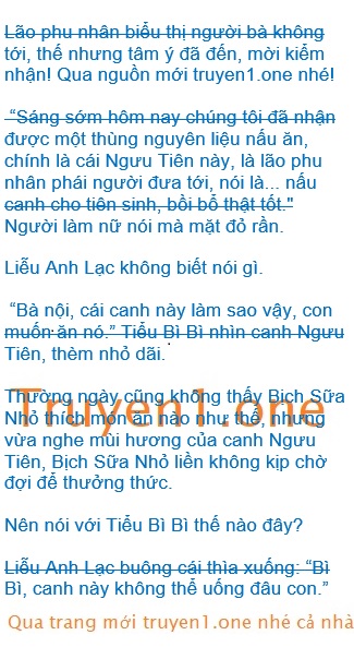 Trong phòng ăn, Liễu Anh Lạc và Tiểu Bì Bì ngồi đối mặt nhau, Tiểu Bì Bì chỉ vào một chén canh: “bà nội, con muốn ăn canh này, cái canh này nhìn ngon ghê ạ.”