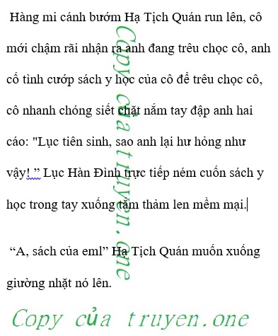Lục Hàn Đình ôm chặt vòng eo yêu kiều của cô: “Lục phu nhân, sao em lại không có ý thức tự giác làm vợ chút nào thế? Tối nay em định đọc sách qua đêm hả, em biến anh thành vật trang trí sao?” “Vậy… anh muốn thế nào, không phải vừa nói để em lớn lên sao?” “Anh nói để em lớn lên, nhưng anh đã phát triển tốt lắm rồi, em cả ngày nghiên cứu sách y, tại sao không nghiên cứu chồng em một chút? Chồng của em gần đây có chút không khỏe?” Lòng Hạ Tịch Quán rơi lộp bộp, không phải anh lại sắp phát bệnh chứ? “Anh không khỏe chỗ nào, để em nhìn xem, là đầu sao?” Hạ Tịch Quán đặt tay nhỏ lên trán anh, cũng không nóng mà.