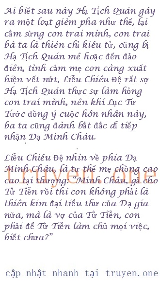 Dạ Minh Châu biết Liễu Chiêu Đệ trước đây chướng mắt mình, nên sau khi quyết định hôn lễ, cô ta càng thêm ân cần lấy lòng Liễu Chiêu Đệ, cũng sớm đổi xưng hô: “Mẹ, hôm nay con gả cho Tử Tiễn rồi, mẹ yên tâm, con thương Tử Tiễn như vậy, kết hôn sau nhất định sẽ đối xử thật tốt với anh ấy, về sau chúng ta chính là người một nhà, con cũng sẽ tận tâm hiếu kính mẹ.”