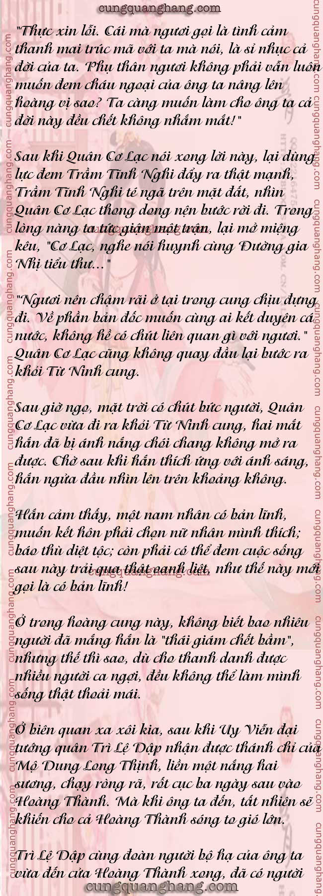 Mộ Dung Ôn Trạch và Mộ Dung Nhược Hồng cũng đích thực "chiếu cố" nội thị và ma ma phụ trách chân tuyển trong cung. Chỉ là, Đường Vân Nhiễm qua mấy vòng nầy vẫn đều bị giữ lại.