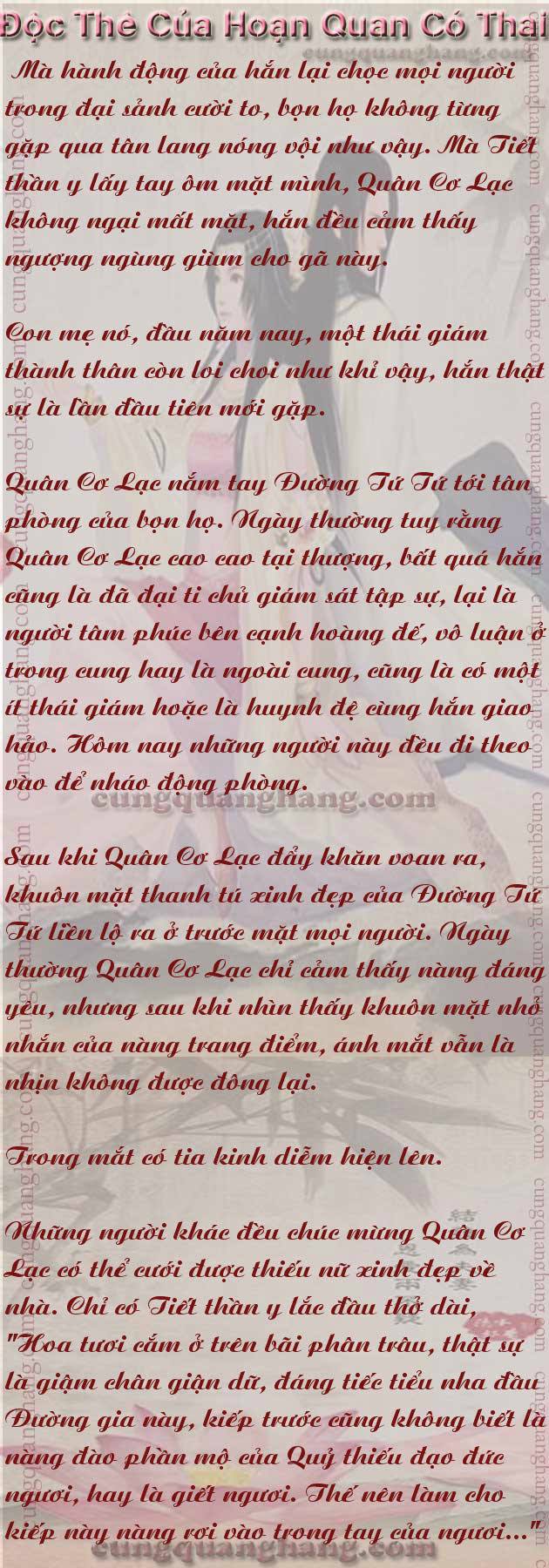 Ả dù cô đơn, tốt xấu cũng là ngủ cùng hoàng đế. Nhưng Đường Tứ Tứ, nàng ta gả cho một tên nô tài hoạn quan. Theo bản chất mà nói, Đường Tứ Tứ cũng thành nô tài.