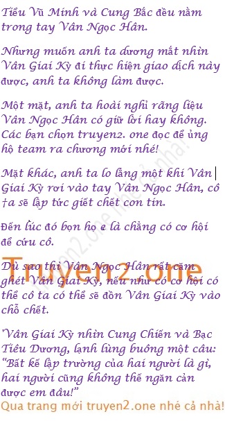 “Vậy chẳng lẽ anh cứ trơ mắt nhìn Tiểu Vũ Minh và Cung Bắc nắm trong tay ‘Vân Ngọc Hân sao?” Vân Giai Kỳ căng thẳng níu lấy vạt áo anh ta: “Cung Chiến, em chỉ cần Tiểu Vũ Minh và Cung Bắc quay về thôi… Chỉ cần là những chuyện em làm được, thì cho dù có phải nộp mạng cho Vân Ngọc Hân cũng không sao.