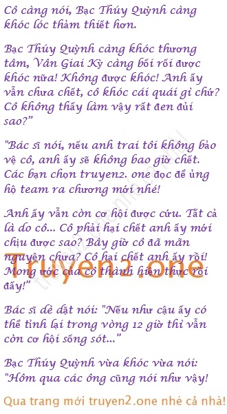 Mấy ngày này đều sống trong lo lắng buồn phiền đã khiến bao buồn bực trong lòng Bạc Thúy Quỳnh bùng nổ: “ Bạc Tiêu Dương! Anh còn bảo vệ cho cô ta làm cái quái gì nữa! Chính cô ta đã hại chết anh Tuấn Phong! Chính cô ta! Tại sao cô ta vẫn chưa chết?”