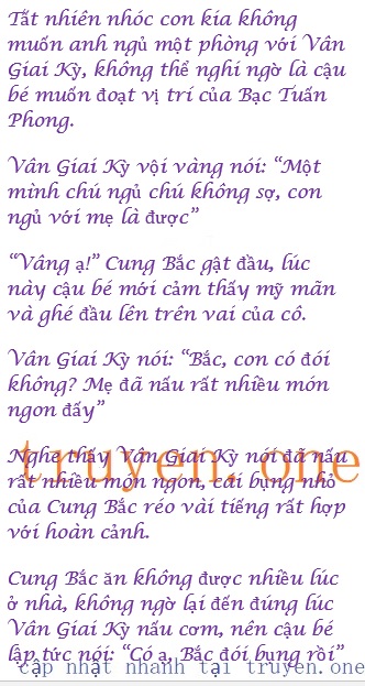 Lúc ăn tối, anh ta rõ ràng nhìn ra được Cung Bắc hơi không yên lòng, nên anh ta cũng ăn qua loa cho xong, rồi dẫn cậu bé đi. Anh ta cũng ăn chưa no. Bạc Tuấn Phong và Cung Chiến vừa đi vào phòng ăn, Cung Bắc đã chiếm một vị trí tốt, cậu bé ngồi sát cạnh Vân Giai Kỳ.