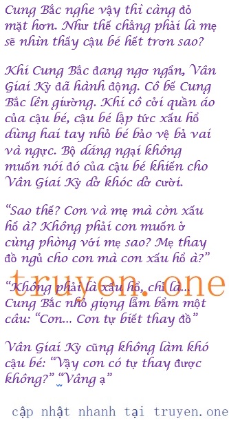 Cung Bắc ngoan ngoãn gật đầu, cậu bé ôm lấy đồ ngủ sạch sẽ rồi chạy vào phòng tắm. Vân Giai Kỳ dõi theo cậu bé, nhìn ở đằng sau cậu bé có thể thấy bên tai nhóc con kia đỏ ửng cả lên. Bắc thật là đáng yêu!