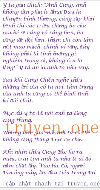 Cung Chiến cảm thấy hơi buồn một chút, nhưng sau đó lại khẽ mỉm cười: “Ừm, ngoan lắm” Nhờ những lời nói ngây thơ của Cung Bắc, khiến Cung Chiến lại cảm thấy an tâm hơn, vừa nãy anh ta còn lo sợ chuyện không đâu, bây giờ dường như trút được gánh nặng, sau đó không thể ở mãi trong phòng vô trùng mà ôm Cung Bắc như vậy được, nên anh ta đành phải luyến tiếc buông tay ra.