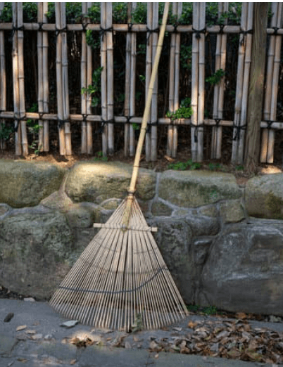 Công cụ quét dọn lá cây là một chiếc cào tre cao cỡ nửa người.