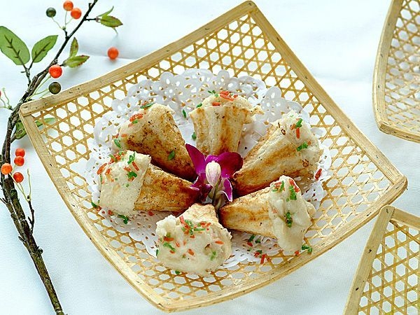 Một bà cụ khom lưng mở cái nắp tre bên trên ra để lộ mẻ bánh ngọt hình hoa mơ đáng yêu xinh xắn.