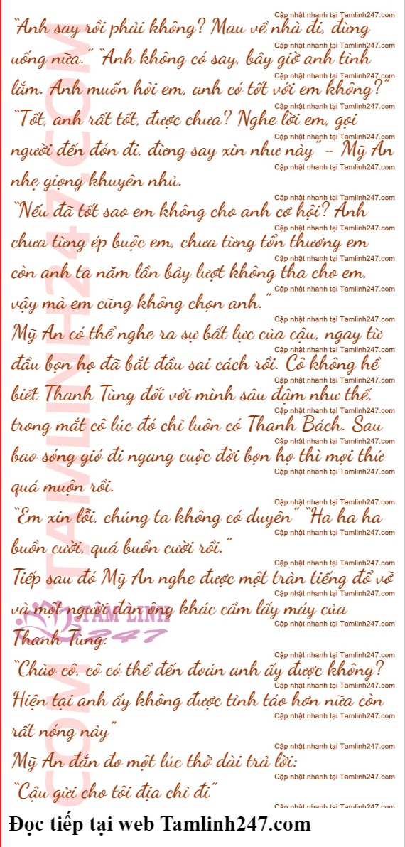 “Vậy chắc mọi thứ giờ an toàn rồi, em cũng chưa bị tổn hại gì, cảm ơn anh đã lo lắng” “Ý em là không muốn anh dính líu tới đúng không?” - Thanh Tùng buồn bã hỏi.