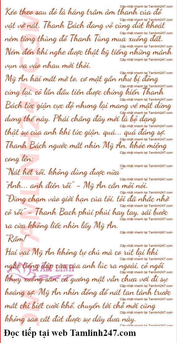 Mỹ An cũng không để Thanh Tùng nán lại lâu hơn, nói thêm mấy câu liền viện cớ đuổi người đi. Thanh Tùng có chút buồn bã nhưng cũng không phản đối, lặng lẽ rời khỏi.