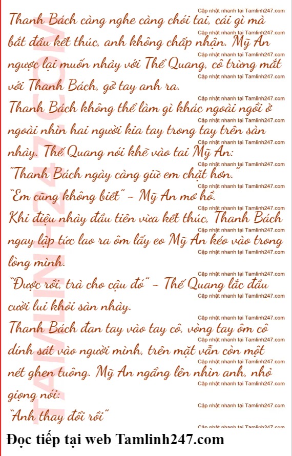 Mỹ An lắc đầu, cô không trả lời được, nhưng anh thật sự thay đổi rồi, cách anh đối xử với cô và cả quan hệ của bọn họ nữa. Mỹ An cảm thấy Thanh Bách trở nên nguy hiểm một cách lạ thường.