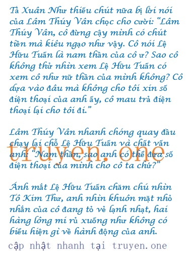 Lệ Hữu Tuấn hoàn toàn không muốn cho cô ta số điện thoại. Anh còn thấy cô ta xấu quá nên phá luôn hy vọng của cô ta Tô Kim Thư tưởng tượng ra cảnh Tả Xuân Như sau khi nhìn thấy hai chữ “xấu, rớt” thì không khỏi buồn cười.