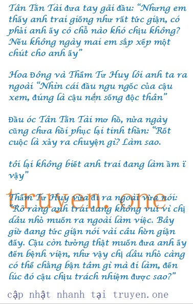 “Nhưng mà Tân Tấn Tài còn muốn nói thêm nhưng bỗng dưng bị Tô Kim Thư cản lại Cô đưa hai người bọn họ ra ngoài, lúc đi đến cửa còn cười dặn dò: “Bác sĩ Tân, không cần chuẩn bị hộ lý đâu, các cậu có chuyện gì thì về trước đi”