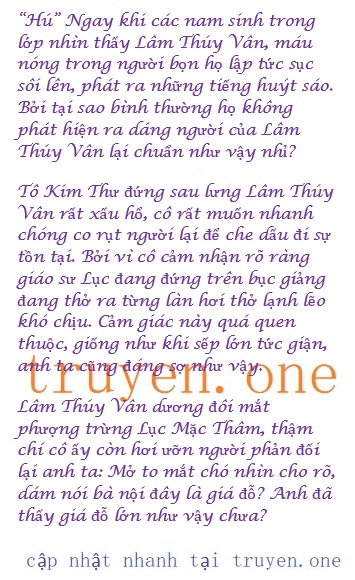 Cuộc trò chuyện rầm rì to nhỏ này nhanh chóng lọt vào tai Lục Mặc Thâm. Anh ta dừng bài giảng và hơi nhìn ra bên ngoài hành lang. Đúng lúc này, Lâm Thuý Vân đang bị tên con trai kia chặn đường xin số điện thoại.