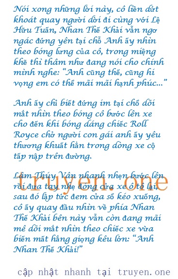 Sau đó xoay người rời đi, chỉ vừa nghiêng đầu, cô liền bắt gặp cặp mắt vô cùng bi thương của Nhan Thế Khải đang nhìn mình từ đầu đến giờ.