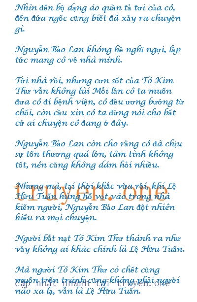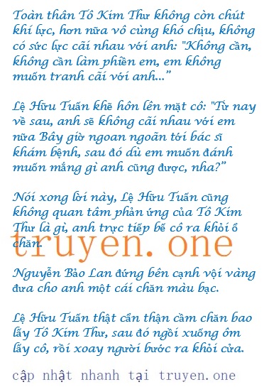 Anh nói nhỏ bên tai cô: “Tô Kim Thư, em an tâm ngủ đi, anh sẽ không… anh hứa với em, từ này về sau sẽ không bao giờ… bắt nạt em nữa”