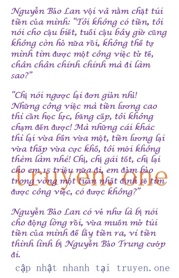 Nguyễn Bảo Lan bị cái vẻ vô lại của cậu ta làm cho toàn thân tức giận đến phát điên: “Bộ phụ này của tôi là đi mượn, Nguyễn Bảo Trung, tôi nói cho cậu biết, tôi đi diễn quả thật là có thù lao, nhưng hiện tại thì vẫn chưa được trả cho một phân tiền nào, mà cho dù có lấy được đi nữa, tôi cũng sẽ không bao giờ có thể đưa cho một người tiêu xài phung phí như cậu, trong nhà có chuyện gì chả nhẽ cậu không biết gì hả? Cha mẹ…”