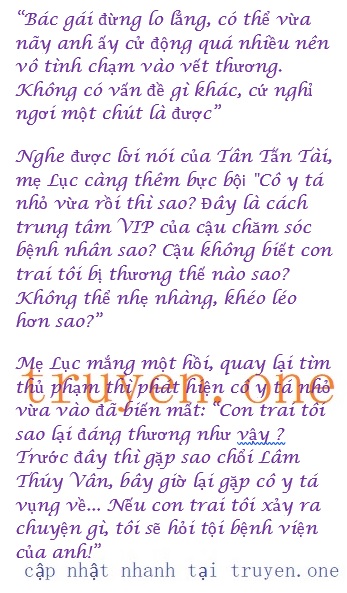 Sau khi Tần Tấn Tài đi vào kiểm tra vết thương của Lục Mặc Thâm, anh ta phát hiện băng gạc trên đầu Lục Mặc Thâm bắt đầu rỉ máu “Gọi ngay cho bác sĩ để xem xét. Tôi nghỉ ngờ vết thương đang chảy máu” Tần Tấn Tài nhíu mày.