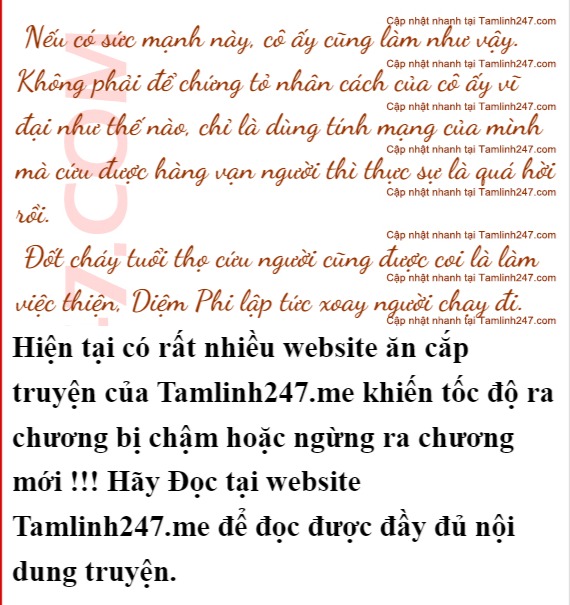 "Cô...! Cố một lúc nhé, tôi sẽ lập tức kêu người sơ tán dân xuống hạ lưu để giảm thiểu thương vong, nhưng nếu không chịu được nữa thì không được cố. Tính mạng của họ là tính mạng, mạng của cô cũng là mạng đấy!”, Diệm Phi cuống đến mức không biết nói gì cho phải.