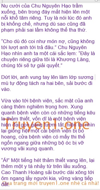 “Cô bình tĩnh đi.” Cao Thanh Hoàng khẽ quát, nhưng cô gái đó lại vẫn kích động la hét. Chu Nguyên Hạo nhịn không nổi đi tới nắm lấy cổ áo của cô gái đó nâng người lên, nhìn chằm chằm vào đôi mắt của cô ta mà nói: “Nếu như cô còn kêu thì tôi sẽ vứt cô lại vào trong bệnh viện đó.”