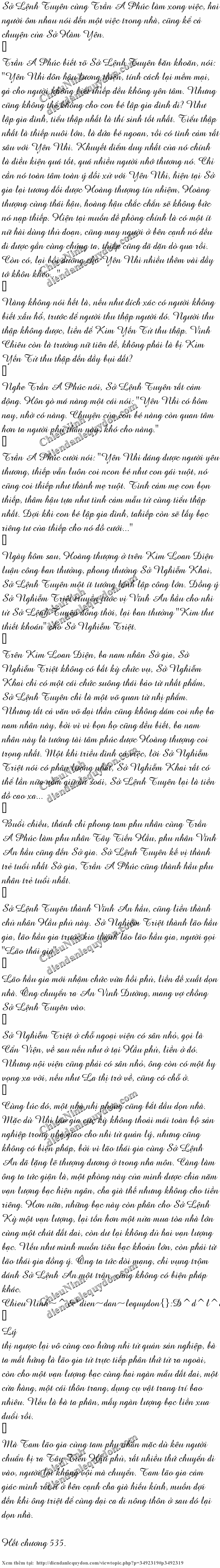 Chứng kiến cảnh này, Sở Lệnh Tuyên yên tâm một chút. Hướng về phía phân tình "huynh muội" từ nhỏ của Hòa vương gia và Yên Nhi, cùng phân tình "mẫu tử" với A Phúc, còn có phẩm chất tốt đẹp của cậu, có lẽ sẽ không phải ủy khuất Yên Nhi đi? Diendanlequydon~ChieuNinh{}@$#^& D^d^l^q^d