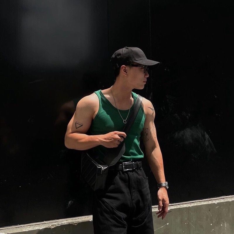 Người bên trái mặc một chiếc áo racerback* màu đen, chân bắt chéo, khuôn mặt tuấn tú mà nham hiểm, cánh tay xăm hình bắt mắt.