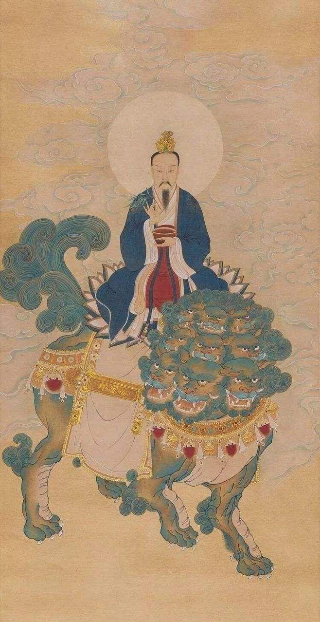 Phạm Chí Ba nhớ lại rồi nói: "Là một ông già, trên đầu đội cái mũ, khá giống cái đồ mà hoàng thượng thời xưa đội ấy, ngồi trên một đài sen, bên cạnh ông ta hình như còn có một con... Không đúng, là 9 con sư tử."