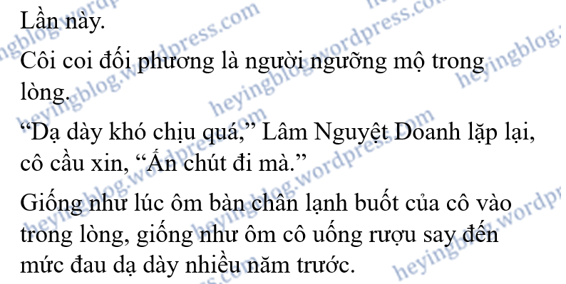 Lâm Nguyệt Doanh cầm tay anh, cô vẫn đang bị ly rượu kia dày vò, dắt tay anh, ép vào vị trí dạ dày, nhăn mày.