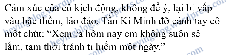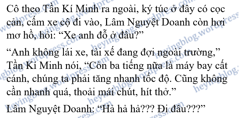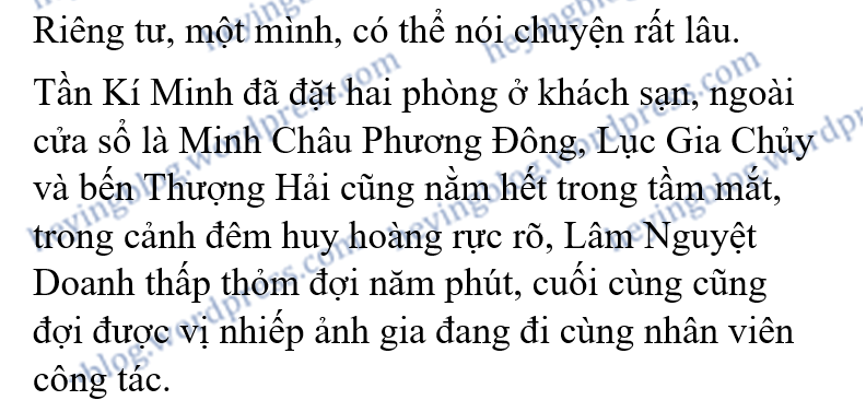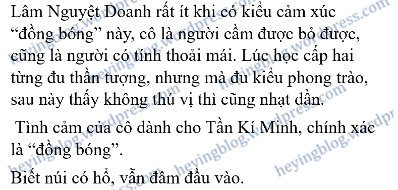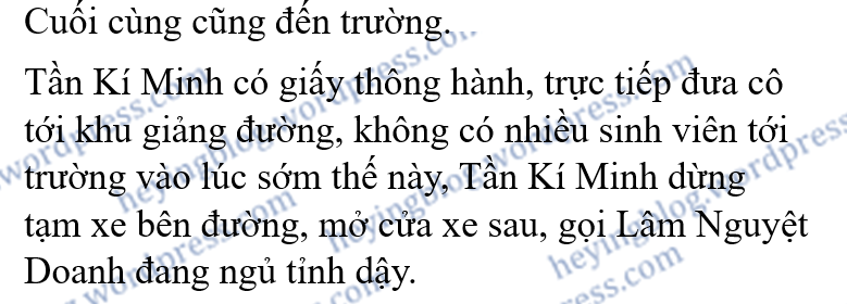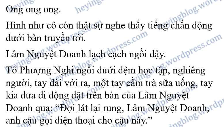 Bạn cùng phòng Thái Lệ gọi cô: “Động đất rồi Nguyệt Doanh, cậu còn lắc nữa là gẫy giá đó, tiền bồi thường giường đắt lắm, cậu nghĩ kĩ đi bae.”