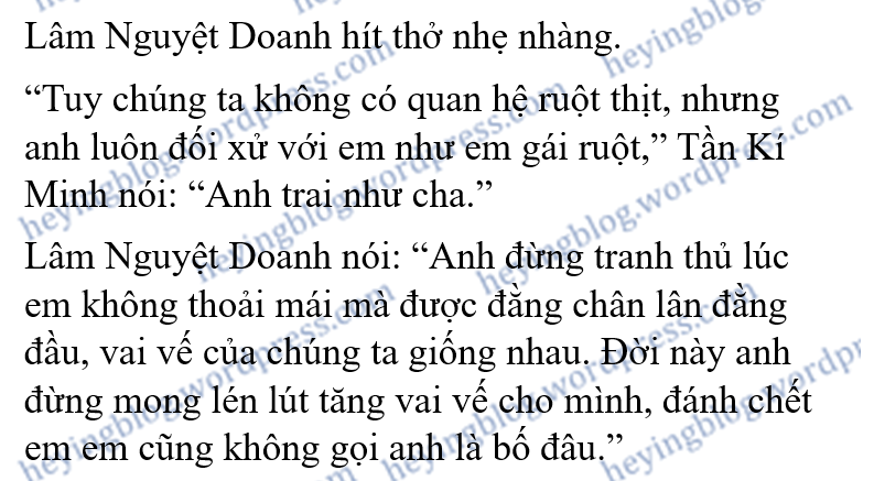 “… Không được thì bỏ đi,” Lâm Nguyệt Doanh nằm trên giường, nhỏ giọng hỏi bản thân, “Mày thích cái gì ở anh ấy? Lâm Nguyệt Doanh? Anh ấy là anh mày mà, hồi nhỏ còn lau nước mũi cho mày đấy, mày điên rồi hả?”