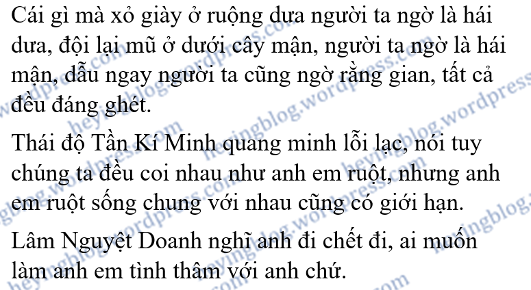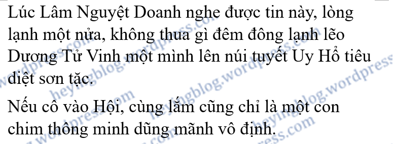 Lâm Nguyệt Doanh nói: “Hay lắm còn biết gieo vần (*), sao anh không đi làm rapper đi. Có điều nhớ phải tránh tị hiềm, tránh tị hiềm cũng có thể an toàn hơn, để anh hot đến vô địch thiên hạ, hot đến thẳng chín mươi chín.”