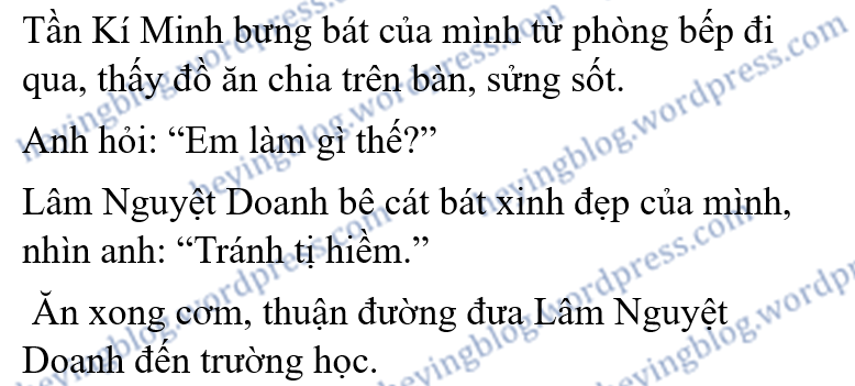 Lúc ăn sáng, Lâm Nguyệt Doanh bưng chén cơm của mình, lấy một cái bánh bao, lại chia một nửa salad rau củ và trứng rán, đổ vào đĩa chia thức ăn của mình, bưng xa xa đến chỗ bàn trà ăn cơm.