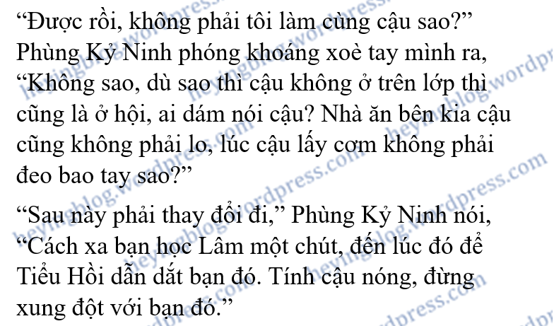 “Kiến nghị của đàn chị Mạnh Hồi cực kỳ hữu dụng,” Lâm Nguyệt Doanh nói, cô nghĩ nghĩ, lại nói một cách từ tốn: “Nếu không có hai câu bây giờ của cậu, nói không chừng giờ tôi định tha thứ cho cậu rồi.”