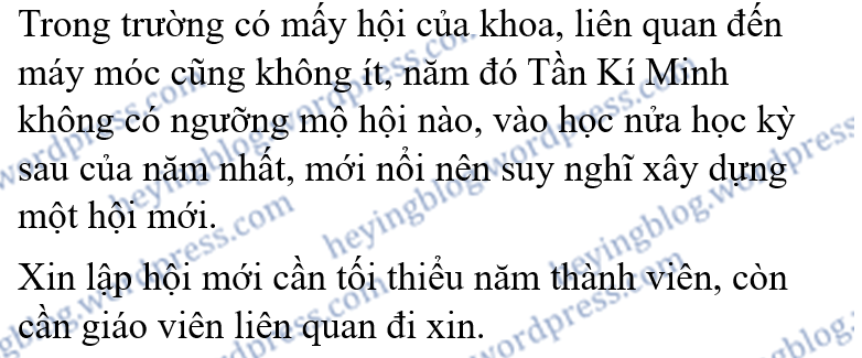 Thế là Tần Kí Minh đã đối chiếu tin tức từ website của trường, tìm thấy bảy bạn học đoạt giải thưởng quốc gia về Cơ điện tử thông minh, viết thư nói với bọn họ, mình định thành lập một Hội Cơ điện tử thông minh mới, và tham gia cuộc thi đấu X cấp quốc gia liên quan được tổ chức vào nửa cuối năm, đã có năm bạn học đoạt giải tham gia, chỉ thiếu một người là có thể thành lập Hội mới.