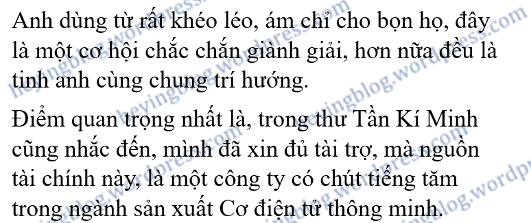 Tần Kí Minh lại đi tới một công ty Cơ điện tử thông minh X mình từng đi thực tập kỳ nghỉ đông, hẹn giám đốc bàn hồi lâu, nói thẳng hiện giờ mình đã thành lập một hội liên quan đến Cơ điện tử thông minh rồi, và thành công lập ra một đội có thể cùng nhau tham gia cuộc thi đấu X cấp quốc gia được tổ chức vào nửa cuối năm. Nếu giám đốc có ý đầu tư cho đội quân tinh anh này, một đội ưu tú chắc chắn đoạt giải, vậy lúc tham gia, nhóm Tần Kí Minh sẽ mặc đồng phục riêng của công ty, tuyên truyền cho bọn họ.