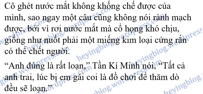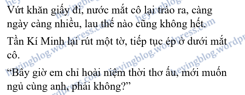 “Anh sắp không nhớ ra lần trước em và anh ngủ cùng nhau là lúc nào rồi,” Tần Kí Minh nói, “Hồi đó em mới tám tuổi.”