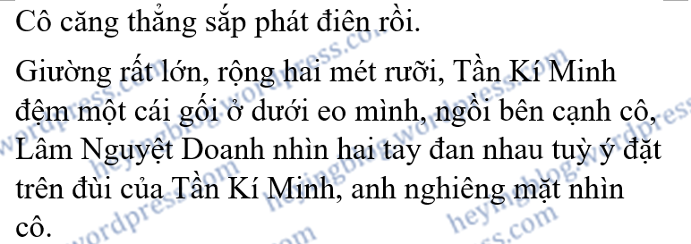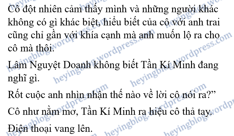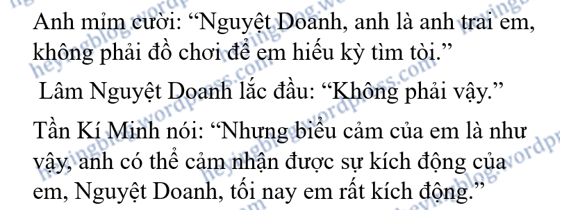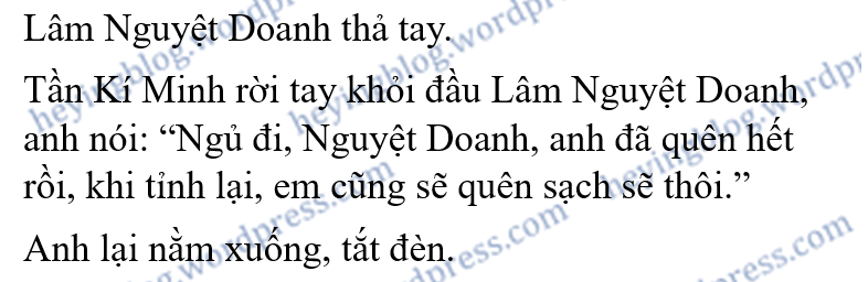 “Hôm nay anh uống nhiều rồi,” Tần Kí Minh thấp giọng nói, “Nguyệt Doanh, anh uống rất nhiều, anh không nhớ em mới nói gì với anh, cũng không nhớ chúng ta đang nói cái gì, bây giờ chúng ta cần phải nghỉ ngơi.”
