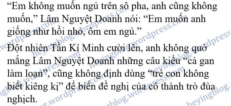 “Nguyệt Doanh,” Tần Kí Minh nói, “Ý em là, tối này em muốn ngủ ở đây?”