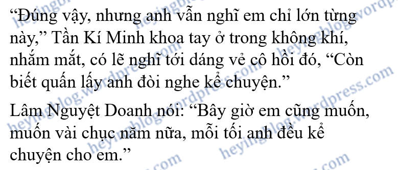 Lâm Nguyệt Doanh nói: “Bây giờ em đã trưởng thành rồi không cần nghe kể chuyện trước khi đi ngủ nữa.”