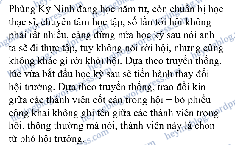 Phó hội trưởng hiện nay có hai người, Mạnh Hồi, đang học năm ba, tỉ mỉ, chín chắn, biệt danh Đại bàng núi cuồng dã bởi vì cực kỳ có thiên phú trong lập trình máy tính. Lập trình viên bình thường không thích giúp đỡ điều chỉnh số hiệu của người khác — thứ này, thà rằng tự mình viết một chương trình mới để chạy được những công năng này, còn dễ hơn mò kim đáy biển điều chỉnh bug.